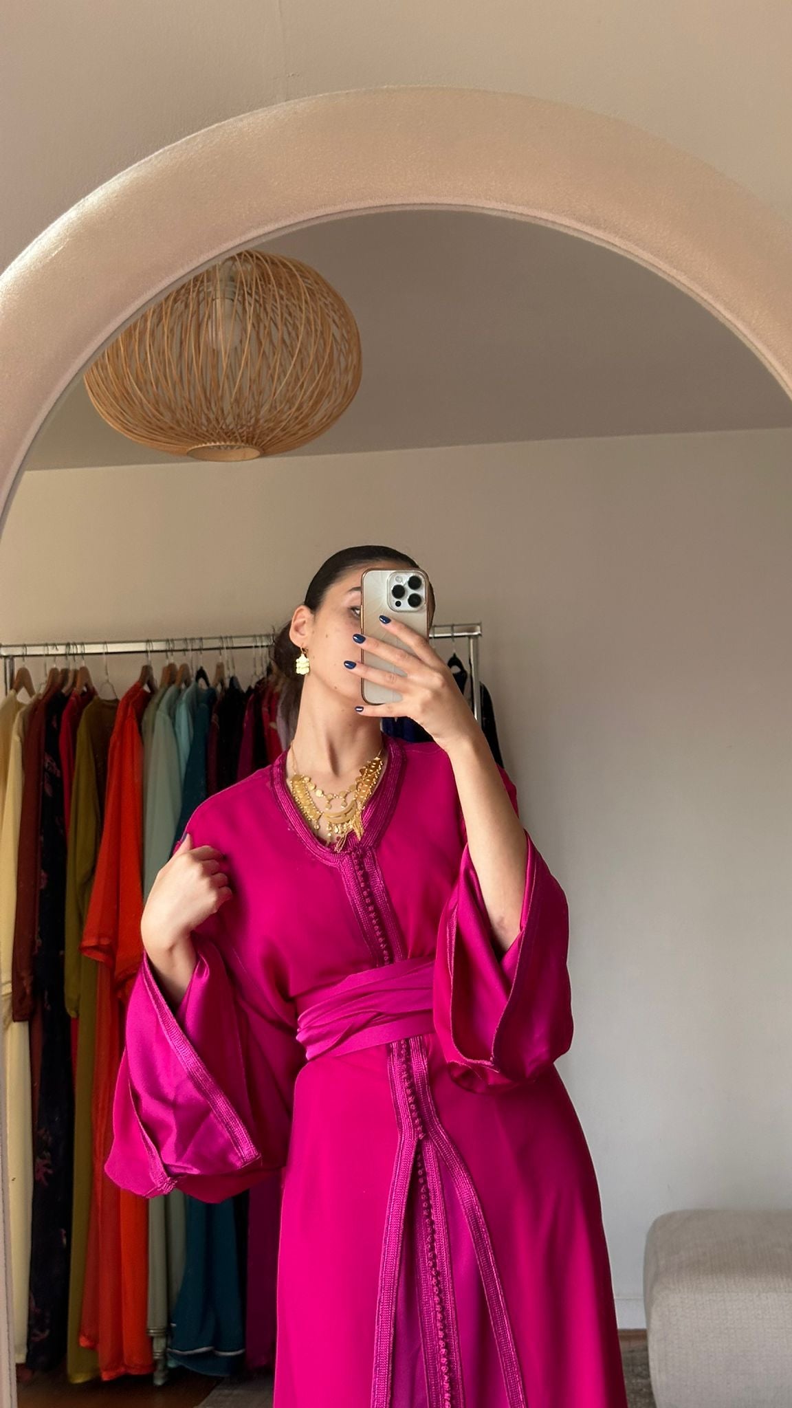 Découvrez notre superbe caftan rose fuchsia en drap de soie et mousseline, une pièce vibrante et élégante qui illumine instantanément la silhouette. Sa couleur intense et féminine apporte une touche audacieuse tout en conservant un raffinement chic, parfait pour les grandes occasions.