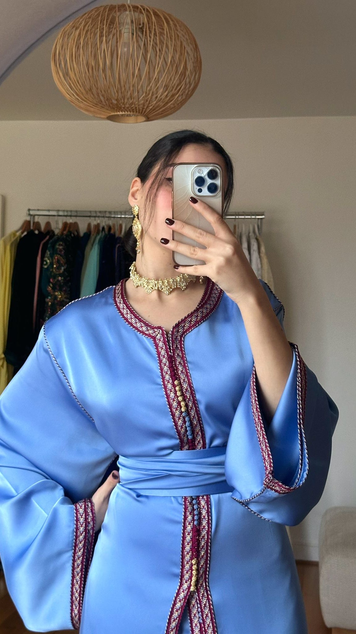 Découvrez notre somptueux caftan bleu poudré aux inspirations berbères, une pièce douce et raffinée qui mêle tradition artisanale et élégance contemporaine. Sa teinte subtilement pastel apporte une allure délicate et sophistiquée, idéale pour les cérémonies, les mariages et les événements d’exception.