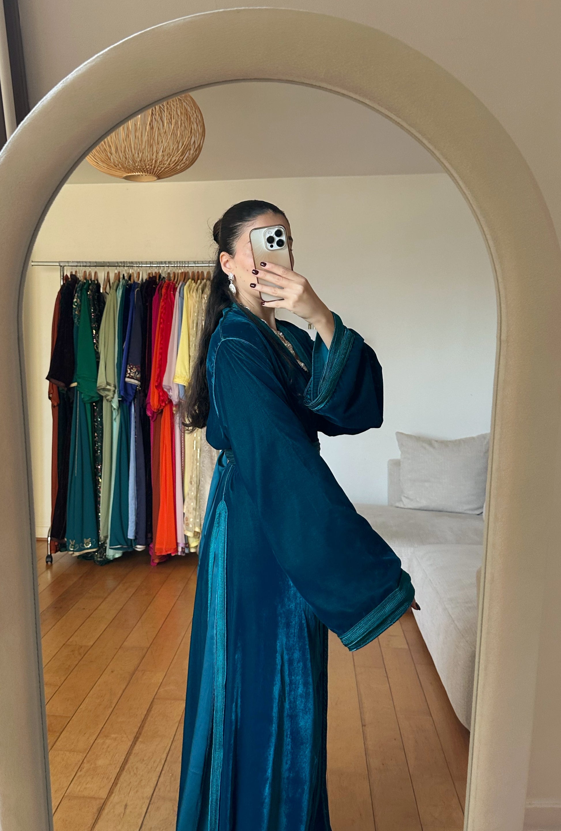 Découvrez notre caftan deux pièces en soie et velours bleu canard, une pièce d’exception qui marie délicatement tradition et modernité.