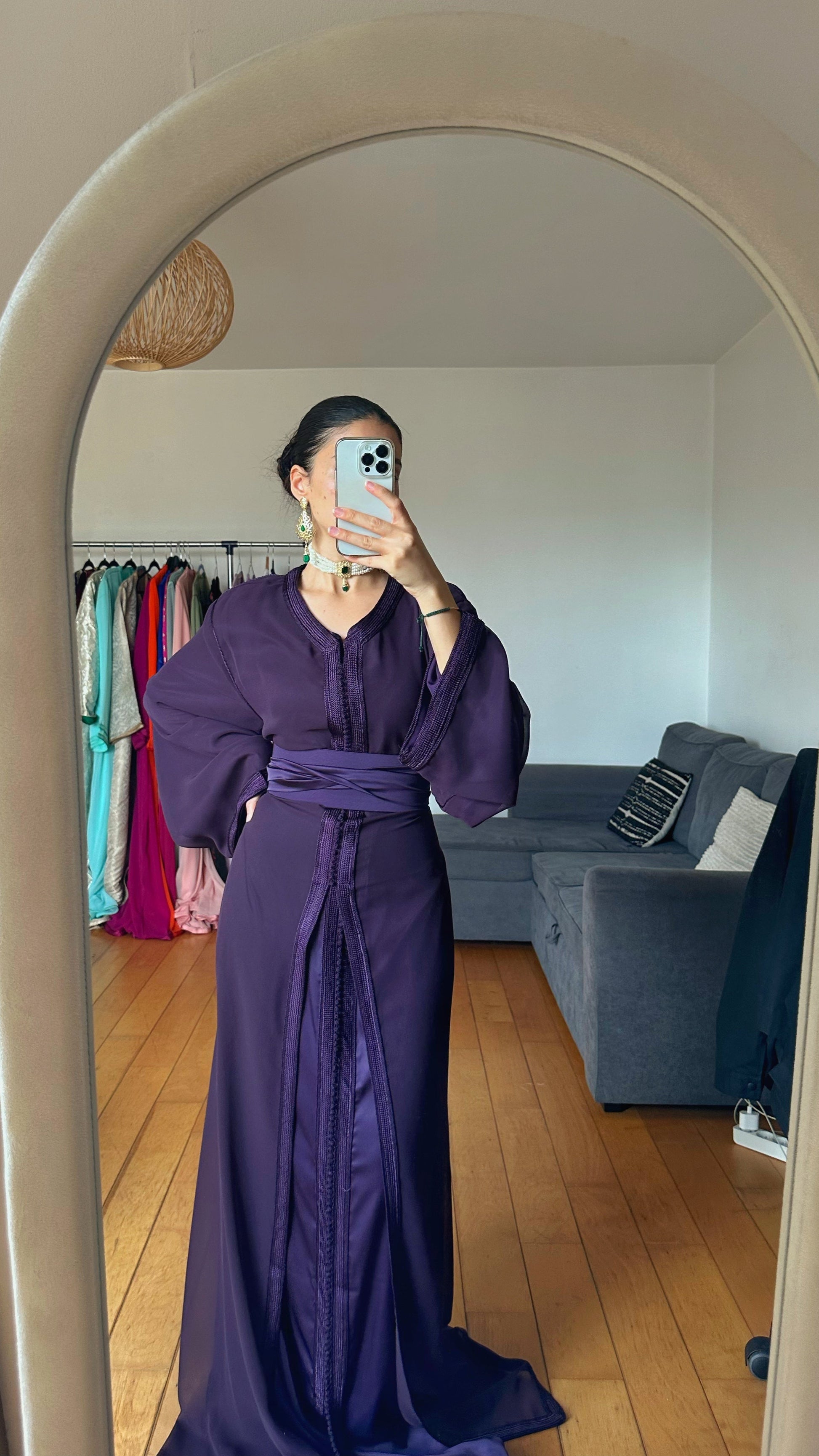 Découvrez l’élégance intemporelle avec ce caftan aubergine, une pièce d’exception imaginée pour celles qui souhaitent allier distinction et modernité. Sa coupe en deux pièces marie avec subtilité la noblesse de la soie et la légèreté aérienne de la mousseline.