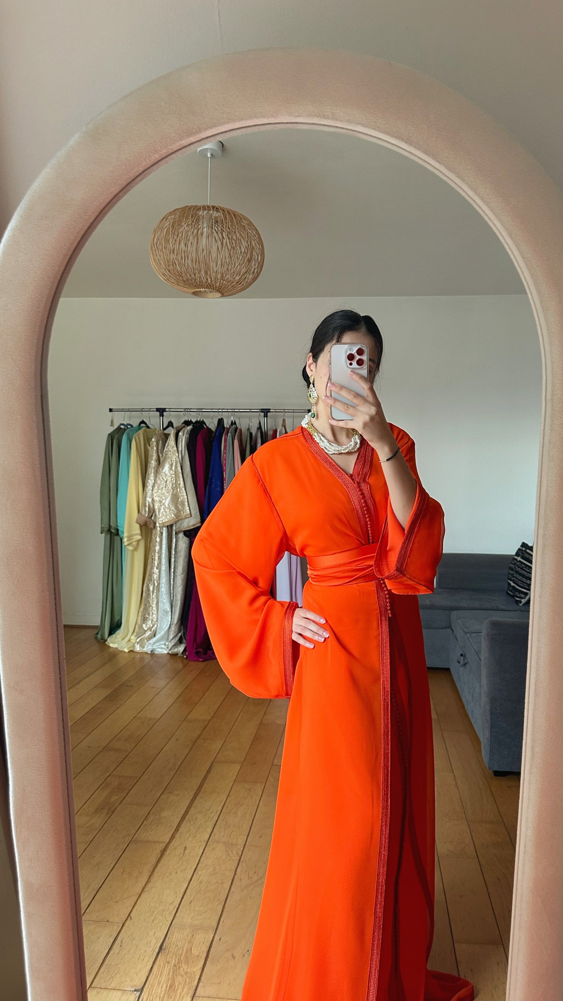 Illuminez vos événements avec ce magnifique caftan orange, une pièce maîtresse alliant tradition et modernité. Conçu en deux parties pour une silhouette fluide et raffinée, cet ensemble se compose d'un caftan intérieur en soie luxueuse et d'une sur-robe en mousseline légère et vaporeuse.