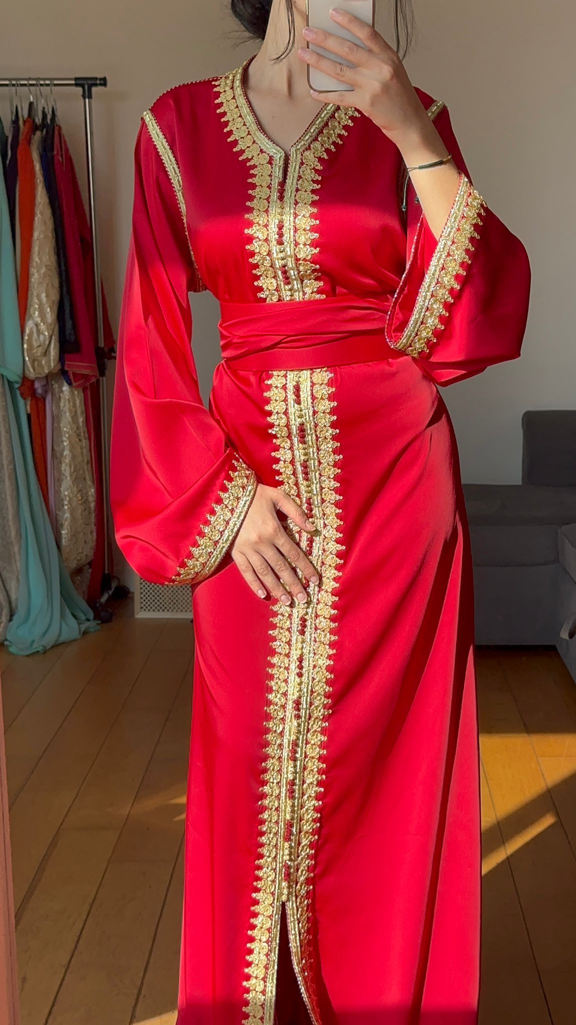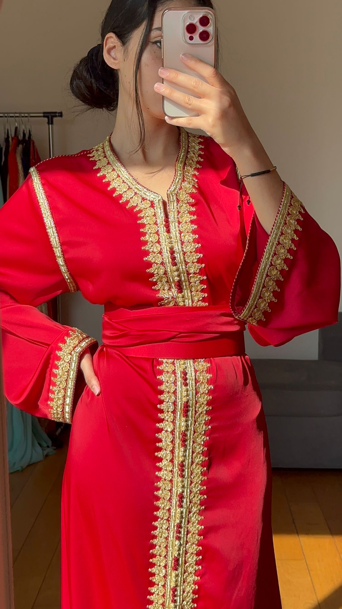 Découvrez notre caftan rouge en drap de soie, une pièce élégante et intemporelle idéale pour les mariages et grandes cérémonies. Sa teinte éclatante sublime la silhouette et apporte une allure prestigieuse.
